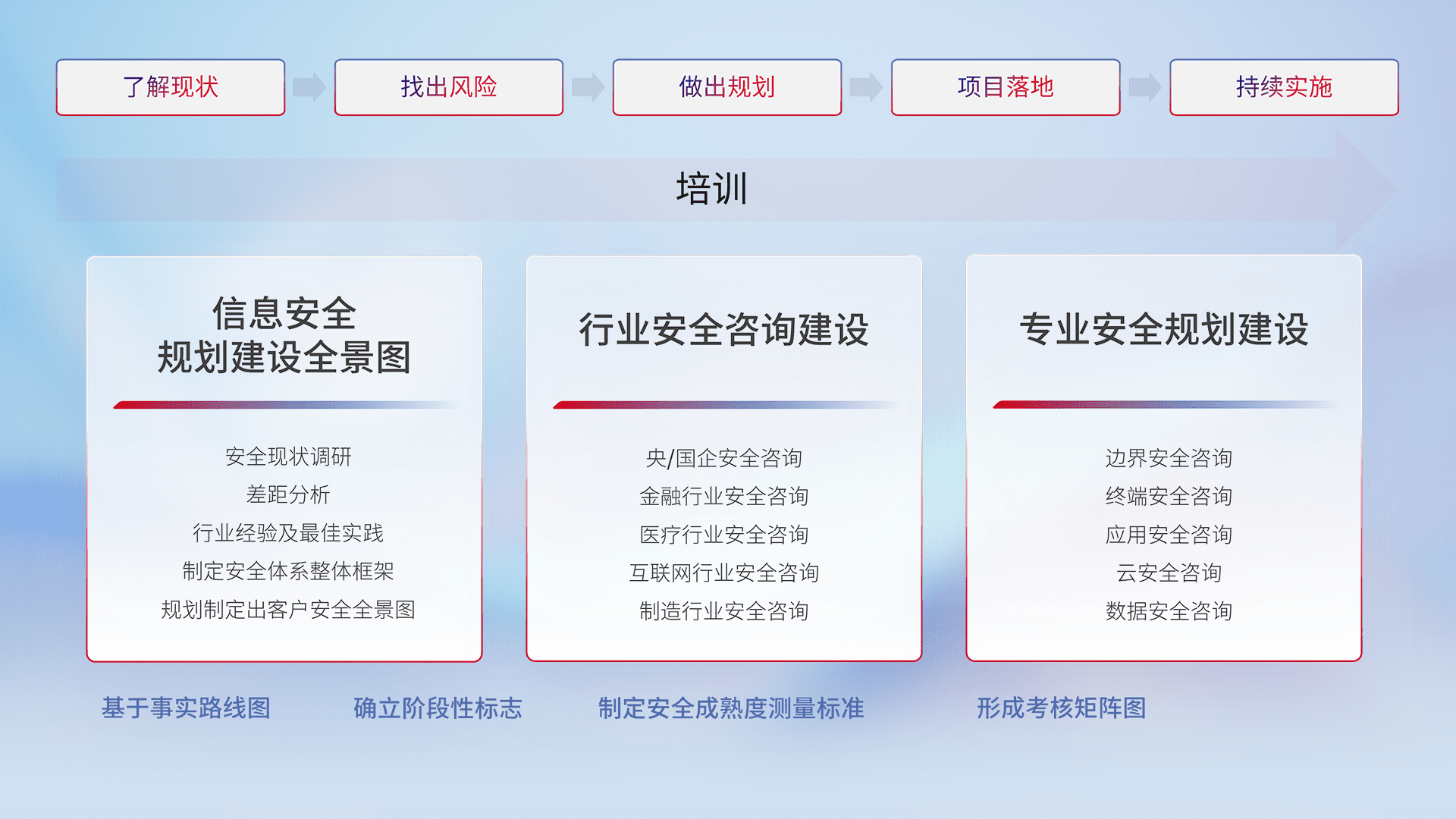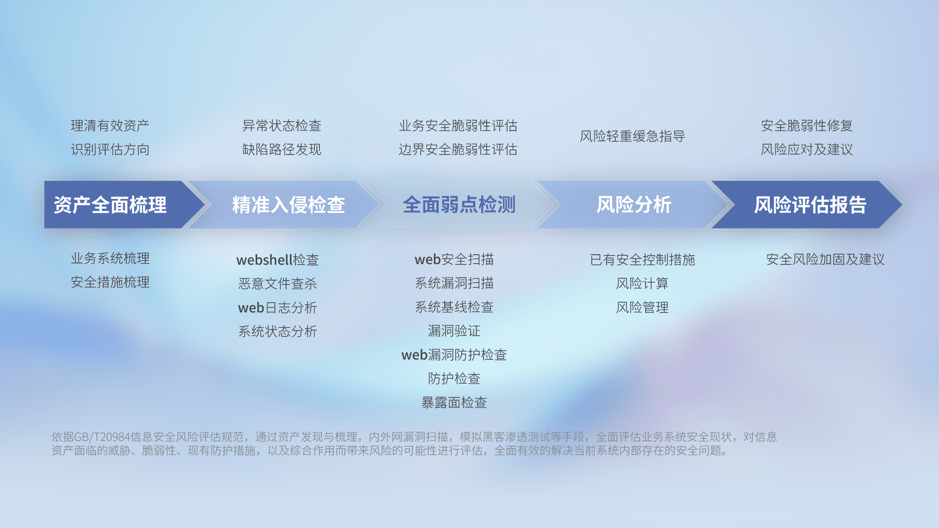 针对客户行业特性,,,以专业的安全服务+多厂商联合解决方案提供专属的一站式安全管理服务,,帮助客户全面感知网络空间威胁,,,基于识别、、、、检测、、、、分析、、防护、、、监测、、响应的服务理论模型,,,,从方案咨询、、、集成交付、、、评估验证、、优化加固、、运维运营,,,,致力于为客户提供完整的闭环管理式安全服务。。。。以实战经验为客户打造高抵御风险的安全体系,,帮助客户发现威胁、、、对抗威胁、、处置威胁,,不断积累安全对抗能力,,,持续保障数字化安全。。