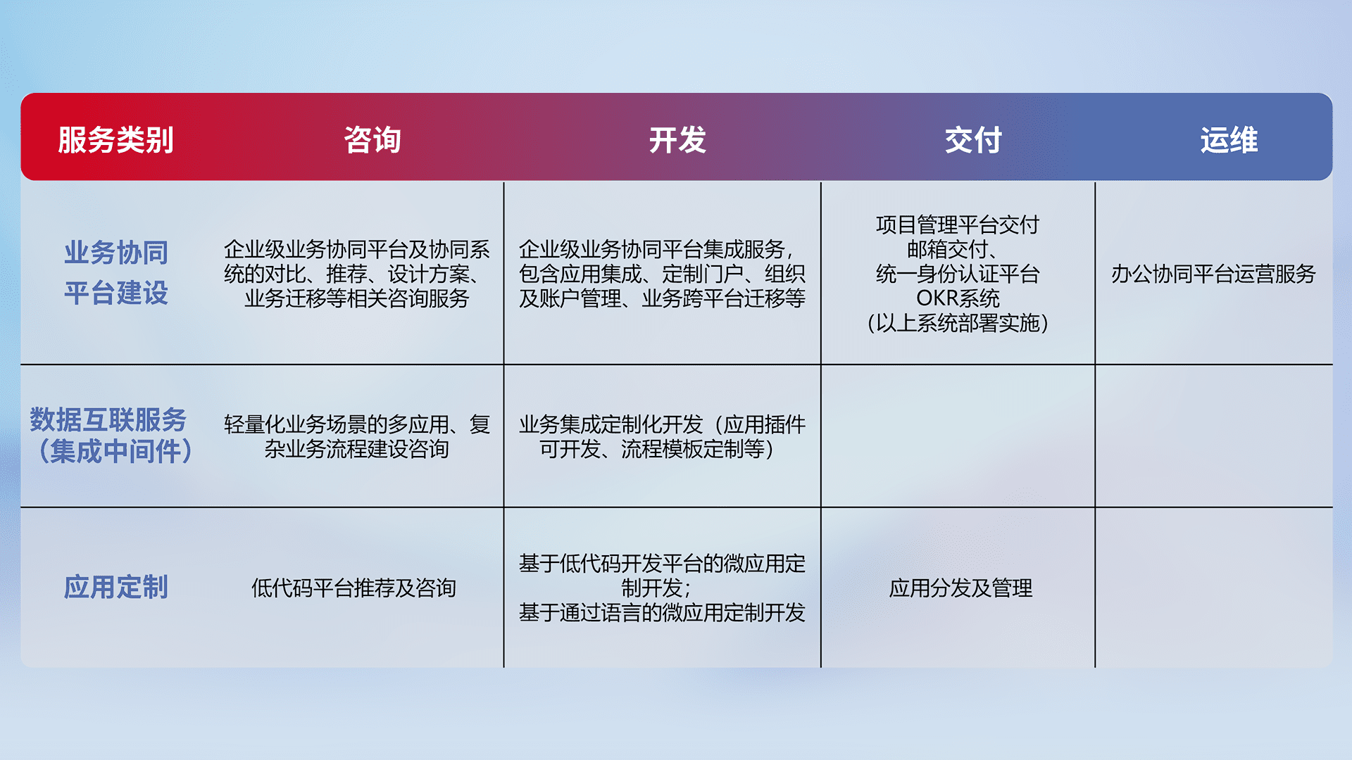 针对钉钉、、、企微、、、IDaas等平台级产品提供产品的规划、、方案、、、交付、、、、定制化开发等服务,,,,实现如统一协同办公、、、智能客户服务、、混合会议管理、、智能数据查询、、、、等业务场景,,,,实现数字化转型。。。